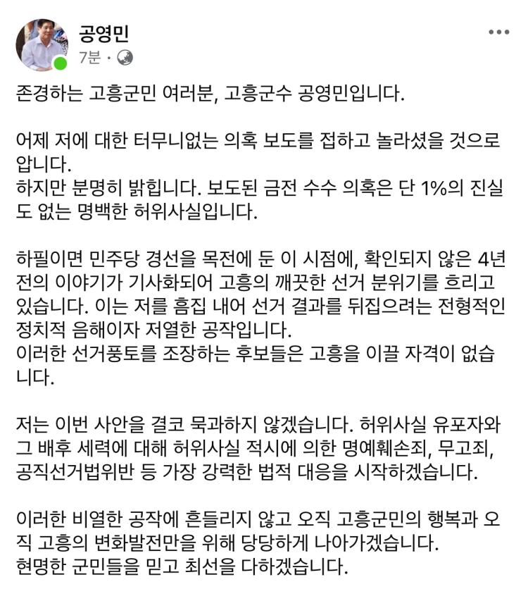 °ø ±º¼ö´Â 4ÀÏ ÀÚ½ÅÀÇ SNS¸¦ ÅëÇØ "ÃÖ±Ù º¸µµµÈ ±ÝÀü ¼ö¼ö ÀÇȤÀº ´Ü 1%ÀÇ Áø½Çµµ ¾ø´Â ÇãÀ§»ç½Ç"À̶ó¸ç "°æ¼±À» ¾ÕµÐ ½ÃÁ¡¿¡¼ È®ÀεÇÁö ¾ÊÀº °ú°Å »ç¾ÈÀ» ±â»çÈÇÑ °ÍÀº ÀǵµÀû ÈìÁý³»±â"¶ó°í ÁÖÀåÇß´Ù.