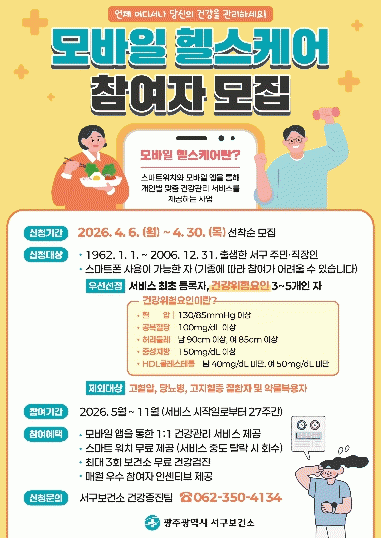 ±¤ÁÖ±¤¿ª½Ã ¼±¸°¡ Áö¿ªÁÖ¹ÎÀÇ °Ç°°ü¸® ¿ª·® °È¸¦ À§ÇØ Á¤º¸Åë½Å±â¼ú(ICT)À» Ȱ¿ëÇÑ °Ç°°ü¸® ¼ºñ½º ¡®¸ð¹ÙÀÏ ÇコÄɾ Âü¿©ÀÚ 125¸íÀ» ¿À´Â 30ÀϱîÁö ¼±Âø¼ø ¸ðÁýÇÑ´Ù.