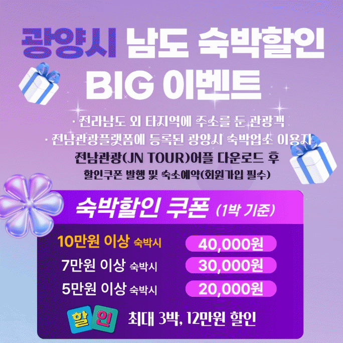 À̺¥Æ® Âü¿©¸¦ Èñ¸ÁÇÏ´Â °ü±¤°´Àº Àü³²°ü±¤Ç÷§Æû(JN TOUR)¿¡ ȸ¿ø°¡ÀÔÇÑ µÚ ¡®³²µµ ¼÷¹ÚÇÒÀÎ BIG À̺¥Æ®¡¯¿¡¼ ¡®±¤¾ç½Ã¡¯¸¦ ¼±ÅÃÇØ ÄíÆùÀ» ¹ß±Þ¹ÞÀ¸¸é µÈ´Ù.
