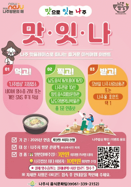 Àü³² ³ªÁֽð¡ ¡®2026 ³ªÁֹ湮ÀÇ ÇØ¡¯¸¦ ¸Â¾Æ ½Ã ´ëÇ¥ À½½Ä ºê·£µåÀÎ ¡®³ªÁÖ¹ä»ó¡¯À» ¾Õ¼¼¿î »ç°èÀý ¹Ì½Ä À̺¥Æ® ¡®¸ÀÀ¸·Î ÀÕ´Â ³ªÁÖ, ¡®¸ÀÀÕ³ª¡¯ÀÇ 2ȸÂ÷(º½) ¿î¿µÀ» º»°ÝÀûÀ¸·Î ½ÃÀÛÇÑ´Ù.